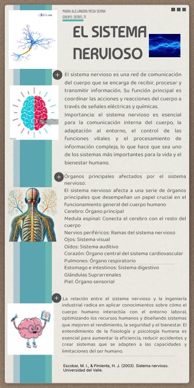 .La relación entre el sistema nervioso y la ingeniería industrial radica en aplicar conocimientos sobre cómo el cuerpo humano interactúa con el entorno laboral, optimizando los recursos humanos y diseñando sistemas que mejoren el rendimiento, la seguridad y el bienestar. El entendimiento de la fisiología y psicología humana es esencial para aumentar la eficiencia, reducir accidentes y crear sistemas que se adapten a las capacidades y limitaciones del ser humano.