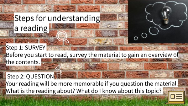 Step 1: SURVEY Before you start to read, survey the material to gain an overview of the contents. Step 2: QUESTION Your reading will be more memorable if you question the material. What is the reading about? What do I know about this topic?