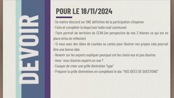 - Se mettre d’accord sur UNE définition de la participation citoyenne - Faire et compléter la diapo (voir boîte mail commune) - Faire portrait de territoire du CCHA (en perspective de nos 3 thèmes ce qui est en place et/ou en réflexion) - Si vous avez des idées de courbes ou cartes pour illustrer nos propos cela pourrait être une bonne idée - Revenir sur les experts expliquer pourquoi ont les choisi eux et pas d’autres - Avez- vous d’autres experts en vue ? - Essayer de créer une grille d’entretien “type” - Préparer la grille d’entretiens en complétant le doc “VOS IDÉES DE QUESTIONS”