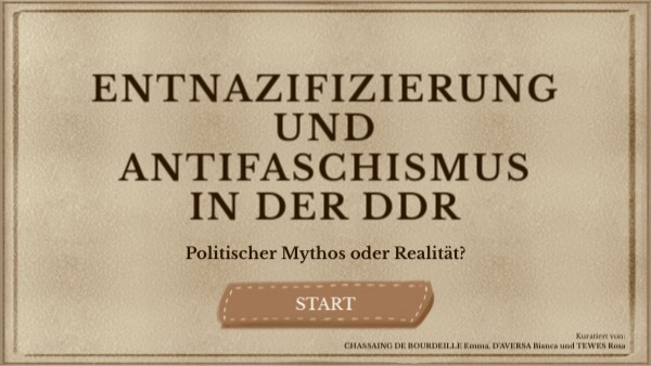 Die DDR hat sich als ein antifaschistisches Regime inszeniert, was von allen nationalsozialistischen Einflüssen befreit ist. Dies wird heute mittlerweile als „Mythos“ oder sogar „Legende“ bezeichnet. In unserer Austellung haben wir untersucht, wie die Entnazifizierung in der SBZ stattgefunden hat und was die DDR später der Bevölkerung erzählt hat. Wie konnte sich die DDR als antifaschistisches Ideal inszenieren?