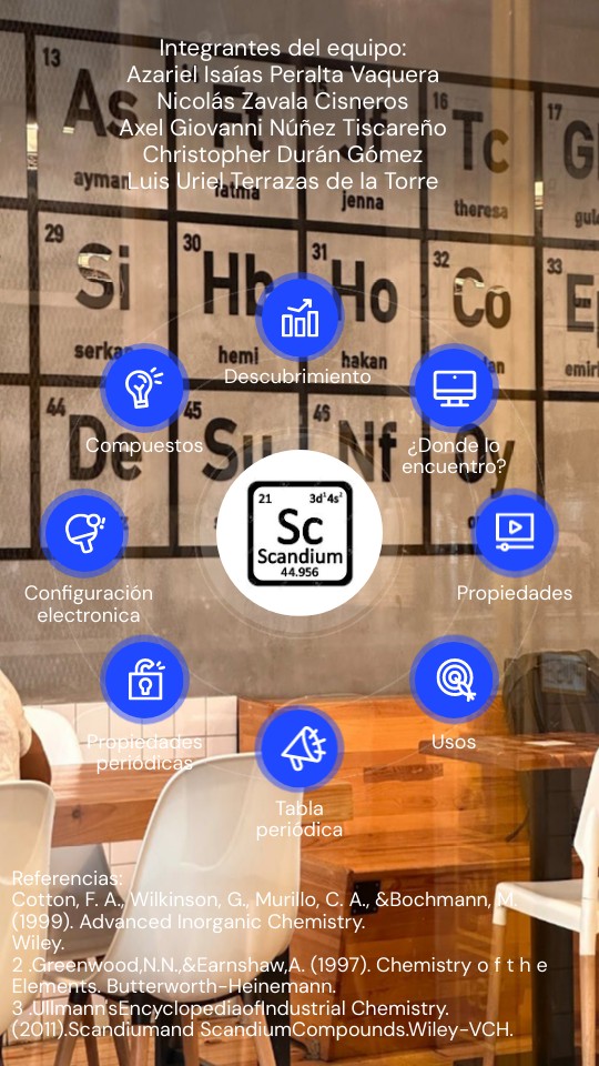 Referencias: Cotton, F. A., Wilkinson, G., Murillo, C. A., &Bochmann, M. (1999). Advanced Inorganic Chemistry. Wiley. 2 .Greenwood,N.N.,&Earnshaw,A. (1997). Chemistry o f t h e Elements. Butterworth-Heinemann. 3 .Ullmann'sEncyclopediaofIndustrial Chemistry.(2011).Scandiumand ScandiumCompounds.Wiley-VCH.