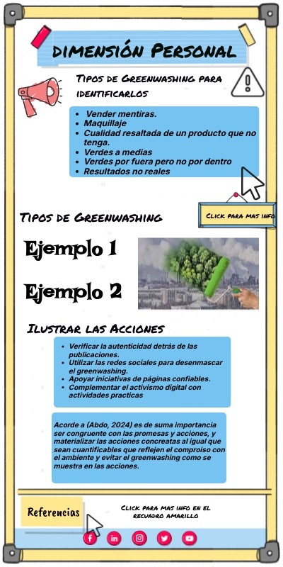 María Agrelo. (2015, October). ¿Qué es el Greenwashing y qué tipos hay? Retrieved November 14, 2024, from Eco-Huella. Sostenibilidad, Cambio Climático y Huella de Carbono website: https://www.eco-huella.com/2015/07/greenwashing.html ¿Qué es el greenwashing y por qué hay que evitarlo? (2023). Retrieved November 14, 2024, from EGADE website: https://egade.tec.mx/es/egade-ideas/opinion/que-es-el-greenwashing-y-por-que-hay-que-evitarlo#:~:text=Tambi%C3%A9n%20conocido%20como%20greenwashing%2C%20el,de%20un%20producto%20o%20servicio. https://loestrategico.com/author/fharrison. (2012, August 13). Activism vs. Slacktivism. Retrieved November 15, 2024, from Lo Estratégico website: https://loestrategico.com/2012/08/activism-vs-slacktivism/ kenneth.villalba@alianzateam.com. (2021, February 22). ¿Qué es greenwashing? 4 ejemplos que explican | ManosVerdes. Retrieved November 15, 2024, from Manos Verdes website: https://www.manosverdes.co/que-es-greenwashing-ejemplos-para-evitarla/ Caballero, C. M. (2024, January 22). Proyecto de ley sobre lavado verde de imagen: cómo salió de la Cámara y qué se espera de la tramitación en el Senado - País Circular. Retrieved November 15, 2024, from País Circular website: https://www.paiscircular.cl/medio-ambiente/proyecto-de-ley-sobre-lavado-verde-de-imagen-como-salio-de-la-camara-y-que-se-espera-de-la-tramitacion-en-el-senado/ Go Vocal. (2014). Retrieved November 15, 2024, from Govocal.com website: https://www.govocal.com/blog/civic-engagement-slacktivism Abdo, A. V. (2024, July 25). Estrategias efectivas para evitar el greenwashing. Retrieved November 15, 2024, from Expansión website: https://expansion.mx/opinion/2024/07/25/estrategias-efectivas-para-evitar-el-greenwashing Los “Reciclos” de Ecoembes son greenwashing. (2020). Retrieved November 15, 2024, from www.elsaltodiario.com website: https://www.elsaltodiario.com/reciclaje/reciclos-ecoembes-sddr-greenwashing