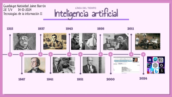 Olivares, R. (2024, 12 septiembre). Línea de Tiempo de la IA: Desde sus Inicios hasta Hoy - Herramientas-IA.com. Herramientas-IA.com. https://herramientas-ia.com/linea-de-tiempo-de-la-inteligencia-artificial/ Velasco, J. J. (2014, 26 noviembre). Ramón Llull y el Ars Magna: los orígenes de las máquinas pensantes. Diario Turing. https://www.eldiario.es/tecnologia/diario-turing/ramon-llull-ars-magna-pensantes_1_4508170.html Albert. (2023, 4 julio). Qué es el álgebra de Boole y dónde se aplica. Escuela Postgrado de Ingeniería y Arquitectura. https://postgradoingenieria.com/algebra-boole/ Vida, H. Y. (2024, 21 marzo). Alan Turing, el padre del ordenador: todas sus aportaciones. La Vanguardia. https://www.lavanguardia.com/historiayvida/historia-contemporanea/20180627/47312986353/que-aporto-ciencia-alan-turing.html Lcg_Admin, & Lcg_Admin. (2021, 12 mayo). Z3: La primera computadora programable - LCG. LCG - IT & Consulting. https://lcg.mx/z3-la-primera-computadora-programable/ Abril, R. R. (2023). Neuronas de McCulloch y Pitts. La Máquina Oráculo. https://lamaquinaoraculo.com/deep-learning/el-modelo-neuronal-de-mcculloch-y-pitts/ Cchristofher. (s. f.). Conferencia de Darthmouth 1956. Conferencia de Darthmouth 1956. https://darthmouthconference.wordpress.com/ De RedaccióN, E. (2024, 26 julio). La Inteligencia Artificial ya va ir a Marte… IA Actual. https://ia-actual.com/la-inteligencia-artificial-ya-va-ir-a-marte/#:~:text=Curiosity%20utiliza%20una%20forma%20de,del%20an%C3%A1lisis%20del%20gas%20quemado.