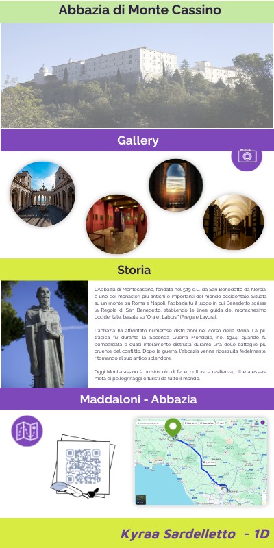 L'Abbazia di Montecassino, fondata nel 529 d.C. da San Benedetto da Norcia, è uno dei monasteri più antichi e importanti del mondo occidentale. Situata su un monte tra Roma e Napoli, l'abbazia fu il luogo in cui Benedetto scrisse la Regola di San Benedetto, stabilendo le linee guida del monachesimo occidentale, basate su "Ora et Labora" (Prega e Lavora). L'abbazia ha affrontato numerose distruzioni nel corso della storia. La più tragica fu durante la Seconda Guerra Mondiale, nel 1944, quando fu bombardata e quasi interamente distrutta durante una delle battaglie più cruente del conflitto. Dopo la guerra, l'abbazia venne ricostruita fedelmente, ritornando al suo antico splendore. Oggi Montecassino è un simbolo di fede, cultura e resilienza, oltre a essere meta di pellegrinaggi e turisti da tutto il mondo.