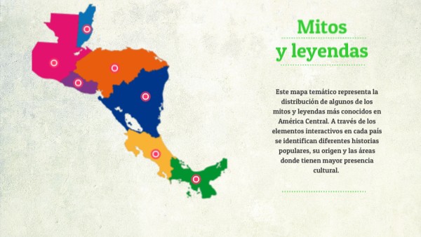 Este mapa temático representa la distribución de algunos de los mitos y leyendas más conocidos en América Central. A través de los elementos interactivos en cada país se identifican diferentes historias populares, su origen y las áreas donde tienen mayor presencia cultural.