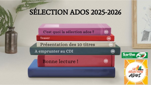 La Sélection Ados s’adresse aux lecteurs à partir de 13 ans. Les bibliothèques sarthoises ainsi que les collèges et lycées professionnels qui le souhaitent peuvent proposer à leur public de découvrir 10 livres en profitant de supports de communication, de pistes de médiation et, sous certains conditions, de lots de livres. Au collège, il existe un partenariat avec la médiathèque de Cérans pour participer à la sélection ados.