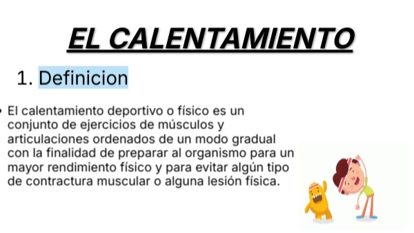 - El calentamiento deportivo o físico es un conjunto de ejercicios de músculos y articulaciones ordenados de un modo gradual con la finalidad de preparar al organismo para un mayor rendimiento físico y para evitar algún tipo de contractura muscular o alguna lesión física.
