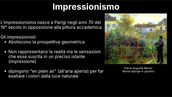 L'impressionismo nasce a Parigi negli anni 70 del 19° secolo in opposizione alla pittura accademica. Gli impressionisti:- Aboliscono la prospettiva geometrica