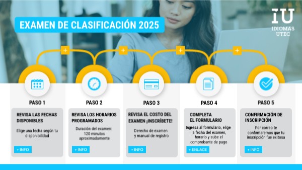 Desarrollarás el examen de clasificación de manera virtual síncrona, es decir, deberás unirte a la videollamada por Google Meet con la cámara encendida durante toda la evaluación, según la franja horaria que elijas. Te enviaremos las pautas del examen y el enlace de la videollamada al correo institucional de UTEC con al menos 48 horas de anticipación ⏰ El examen de clasificación tiene una duración aproximada de dos horas. Puedes elegir una de las tres franjas horarias disponibles según tu disponibilidad. Si necesitas solicitar un cambio de franja, debes hacerlo con al menos 24 horas de anticipación enviando un correo a idiomas@utec.edu.pe. No se aceptarán cambios el día de la evaluación.