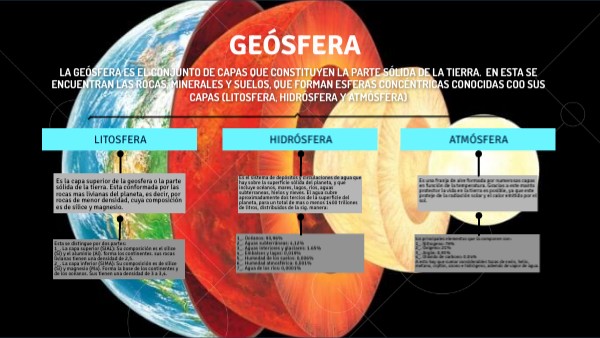 LA GEÓSFERA ES EL CONJUNTO DE CAPAS QUE CONSTITUYEN LA PARTE SÓLIDA DE LA TIERRA. EN ESTA SE ENCUENTRAN LAS ROCAS, MINERALES Y SUELOS, QUE FORMAN ESFERAS CONCÉNTRICAS CONOCIDAS COO SUS CAPAS (LITOSFERA, HIDRÓSFERA Y ATMÓSFERA)