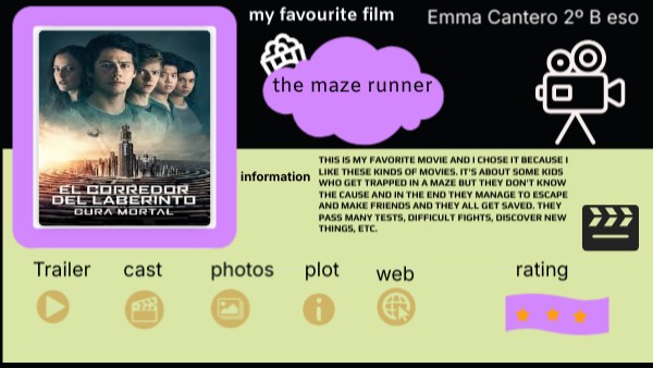 This is my favorite movie and I chose it because I like these kinds of movies. It's about some kids who get trapped in a maze but they don't know the cause and in the end they manage to escape and make friends and they all get saved. They pass many tests, difficult fights, discover new things, etc.