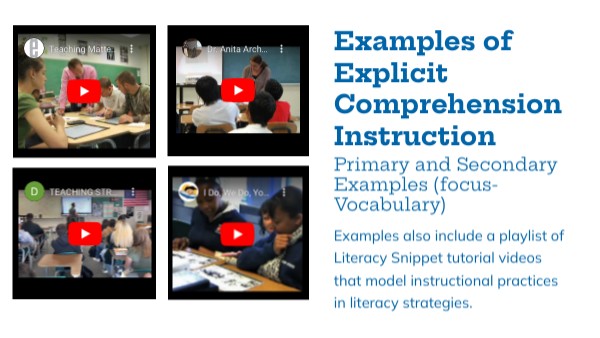 Examples also include a playlist of Literacy Snippet tutorial videos that model instructional practices in literacy strategies.