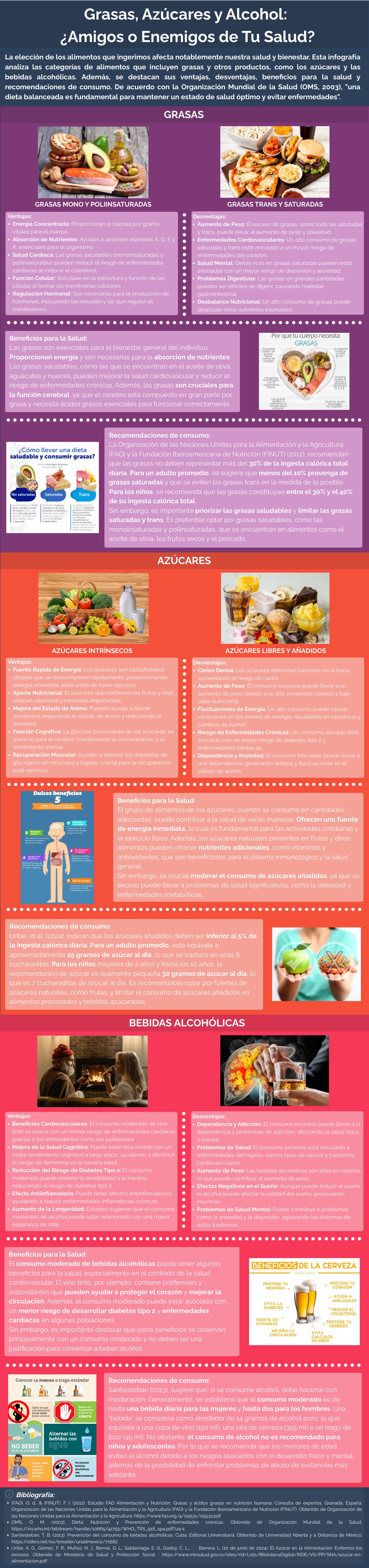 La elección de los alimentos que ingerimos afecta notablemente nuestra salud y bienestar. Esta infografía analiza las categorías de alimentos que incluyen grasas y otros productos, como los azúcares y las bebidas alcohólicas. Además, se destacan sus ventajas, desventajas, beneficios para la salud y recomendaciones de consumo. De acuerdo con la Organización Mundial de la Salud (OMS, 2003), "una dieta balanceada es fundamental para mantener un estado de salud óptimo y evitar enfermedades".
