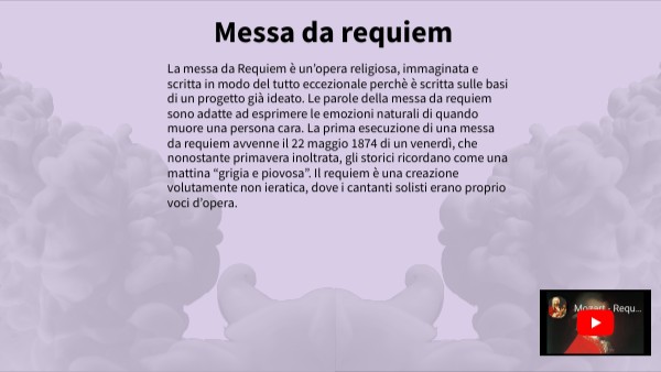 La messa da Requiem è un’opera religiosa, immaginata e scritta in modo del tutto eccezionale perchè è scritta sulle basi di un progetto già ideato. Le parole della messa da requiem sono adatte ad esprimere le emozioni naturali di quando muore una persona cara. La prima esecuzione di una messa da requiem avvenne il 22 maggio 1874 di un venerdì, che nonostante primavera inoltrata, gli storici ricordano come una mattina “grigia e piovosa”. Il requiem è una creazione volutamente non ieratica, dove i cantanti solisti erano proprio voci d’opera.
