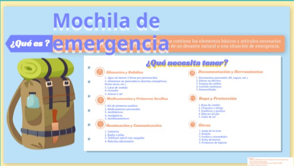 Una mochila de emergencia es un contenedor portátil que contiene los elementos básicos y artículos necesarios para sobrevivir durante las primeras horas o días después de un desastre natural o una situación de emergencia.