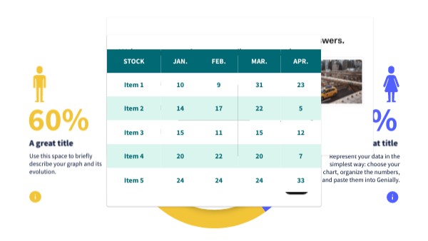 Represent your data in the simplest way: choose your chart, organize the numbers, and paste them into Genially.