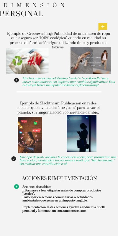 Acciones deseables: Informarse y leer etiquetas antes de comprar productos “verdes”. Participar en acciones comunitarias o actividades ambientales que generen un impacto tangible. Implementación: Estas acciones ayudan a reducir la huella personal y fomentan un consumo consciente.
