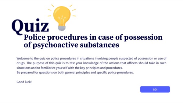 Welcome to the quiz on police procedures in situations involving people suspected of possession or use of drugs. The purpose of this quiz is to test your knowledge of the actions that officers should take in such situations and to familiarize yourself with the key principles and procedures. Be prepared for questions on both general principles and specific police procedures. Good luck!