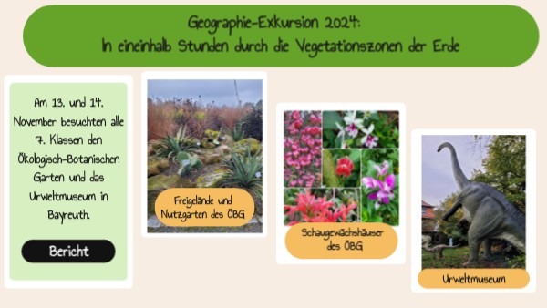 Am 13. und 14. November besuchten die siebten Klassen unserer Schule den Ökologisch-Botanischen Garten der Uni Bayreuth und das Urweltmuseum. Nach einer kurzen Busfahrt startete der Exkursionstag mit einer Führung durch die Gewächshäuser des botanischen Gartens, wo wir einen Einblick in die Pflanzenvielfalt der unterschiedlichen Klima- und Vegetationszonen des blauen Planeten erhielten. Man konnte Heilpflanzen wie die Aloe Vera bewundern, aber auch sehr stachelige Baumarten. Besonders beeindruckte uns die Schutzfunktion der Mimose, einer tropischen Pflanze, welche bei nur einer Berührung ihre Blätter einklappte. Nachdem wir durch die verschiedenen Zonen innen gelaufen waren, reife Kaki- und Sternfrüchte entdeckten und viel neues und spannendes Wissen zum Beispiel über den Toborochi-Baum (Flaschenbaum) aufgesaugt hatten, ging es nach draußen.