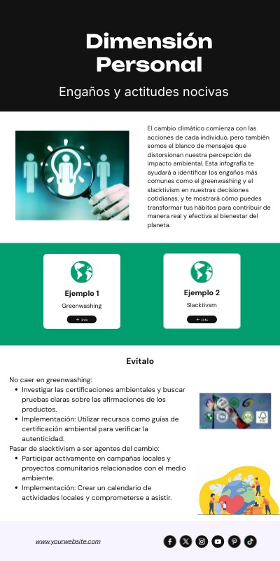El cambio climático comienza con las acciones de cada individuo, pero también somos el blanco de mensajes que distorsionan nuestra percepción de impacto ambiental. Esta infografía te ayudará a identificar los engaños más comunes como el greenwashing y el slacktivism en nuestras decisiones cotidianas, y te mostrará cómo puedes transformar tus hábitos para contribuir de manera real y efectiva al bienestar del planeta.
