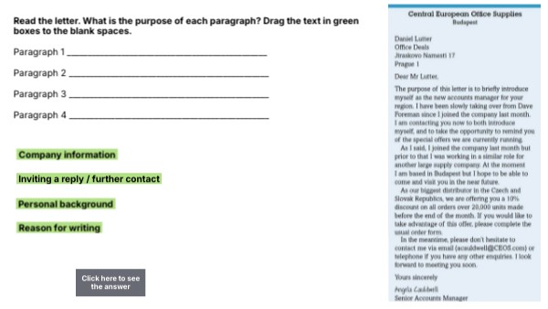 Read the letter. What is the purpose of each paragraph? Drag the text in green boxes to the blank spaces. Paragraph 1 ________________________________________________ Paragraph 2 ________________________________________________ Paragraph 3 ________________________________________________ Paragraph 4 ________________________________________________