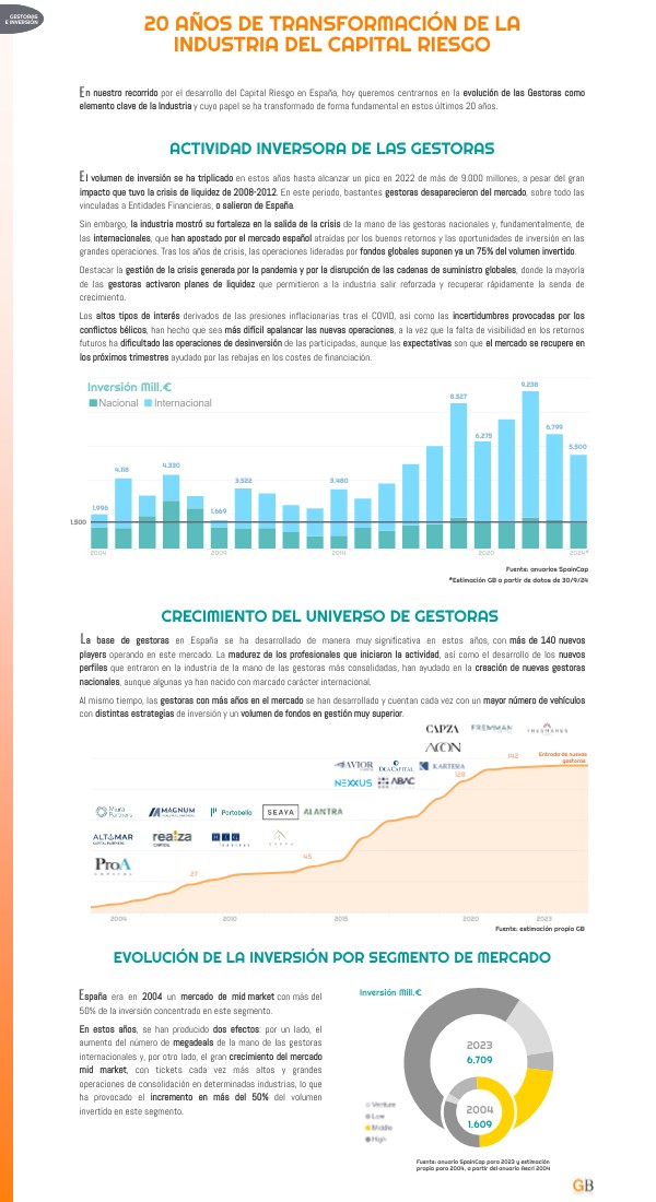 n nuestro recorrido por el desarrollo del Capital Riesgo en España, hoy queremos centrarnos en la evolución de las Gestoras como elemento clave de la Industria y cuyo papel se ha transformado de forma fundamental en estos últimos 20 años.