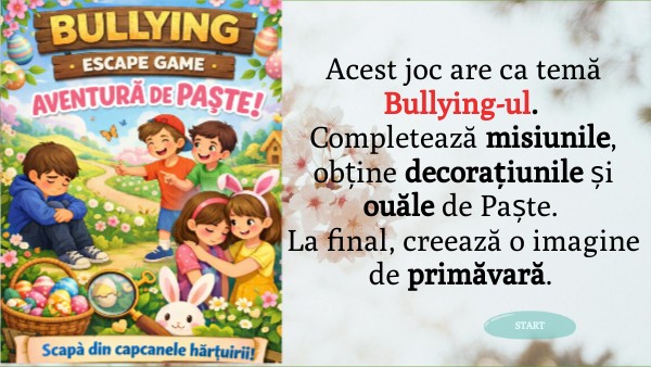 Acest joc are ca temă Bullying-ul. Completează misiunile, obține decorațiunile și ouăle de Paște. La final, creează o imagine de primăvară.