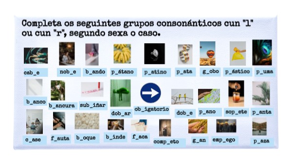 Completa os seguintes grupos consonánticos cun "l" ou cun "r", segundo sexa o caso.