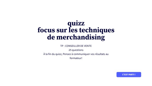TP : CONSEILLER DE VENTE 25 questions À la fin du quizz, Pensez à communiquer vos résultats au formateur!