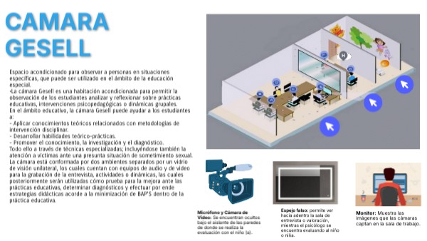 Espacio acondicionado para observar a personas en situaciones específicas, que puede ser utilizado en el ámbito de la educación especial. •La cámara Gesell es una habitación acondicionada para permitir la observación de los estudiantes analizar y reflexionar sobre prácticas educativas, intervenciones psicopedagógicas o dinámicas grupales. En el ámbito educativo, la cámara Gesell puede ayudar a los estudiantes a: - Aplicar conocimientos teóricos relacionados con metodologías de intervención disciplinar. - Desarrollar habilidades teórico-prácticas. - Promover el conocimiento, la investigación y el diagnóstico. Todo ello a través de técnicas especializadas; incluyéndose también la atención a víctimas ante una presunta situación de sometimiento sexual. La cámara está conformada por dos ambientes separados por un vidrio de visión unilateral, los cuales cuentan con equipos de audio y de video para la grabación de la entrevista, actividades o dinámicas, las cuales posteriormente serán utilizadas cómo prueba para la mejora ante las prácticas educativas, determinar diagnósticos y efectuar por ende estrategias didácticas acorde a la minimización de BAP'S dentro de la práctica educativa.