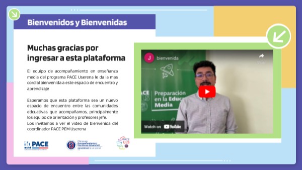 El equipo de acompañamiento en enseñanza media del programa PACE Userena le da la mas cordial bienvenida a este espacio de encuentro y aprendizaje Esperamos que esta plataforma sea un nuevo espacio de encuentro entre las comunidades edcuativas que acompañamos, principalmente los equipo de orientación y profesores jefe. Los invitamos a ver el video de bienvenida del coordinador PACE PEM Userena