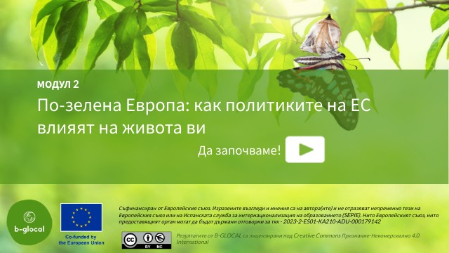 В този микроурок ще се запознаете с основните политики и инициативи на Европейския съюз в областта на околната среда, насочени към справяне с изменението на климата, опазване на биологичното разнообразие и насърчаване на устойчивото развитие. Той разглежда как тези политики засягат гражданите и местните общности, като същевременно помагат на Европа да върви към по-екологично бъдеще.