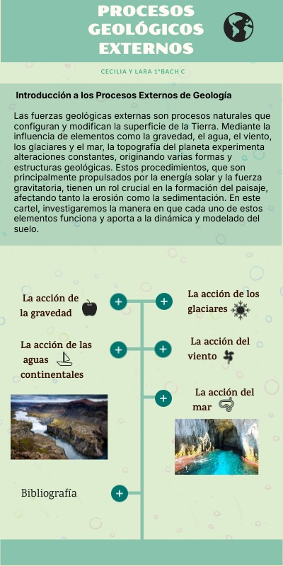 Introducción a los Procesos Externos de Geología Las fuerzas geológicas externas son procesos naturales que configuran y modifican la superficie de la Tierra. Mediante la influencia de elementos como la gravedad, el agua, el viento, los glaciares y el mar, la topografía del planeta experimenta alteraciones constantes, originando varias formas y estructuras geológicas. Estos procedimientos, que son principalmente propulsados por la energía solar y la fuerza gravitatoria, tienen un rol crucial en la formación del paisaje, afectando tanto la erosión como la sedimentación. En este cartel, investigaremos la manera en que cada uno de estos elementos funciona y aporta a la dinámica y modelado del suelo.