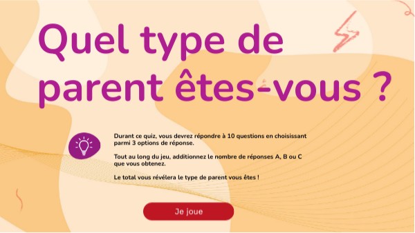 Durant ce quiz, vous devrez répondre à 10 questions en choisissant parmi 3 options de réponse. Tout au long du jeu, additionnez le nombre de réponses A, B ou C que vous obtenez. Le total vous révélera le type de parent vous êtes !