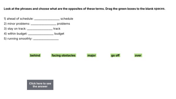 Look at the phrases and choose what are the opposites of these terms. Drag the green boxes to the blank spaces. 1) ahead of schedule: ___________________ schedule 2) minor problems: ___________________ problems 3) stay on track: ___________________ track 4) within budget: ___________________ budget 5) running smoothly: ___________________