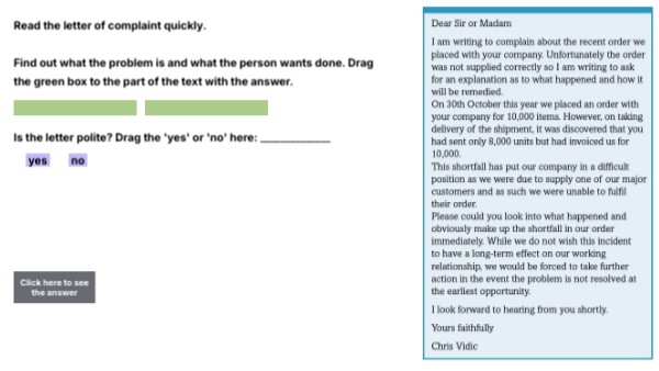 Read the letter of complaint quickly. Find out what the problem is and what the person wants done. Drag the green box to the part of the text with the answer. Is the letter polite? Drag the 'yes' or 'no' here: ______________