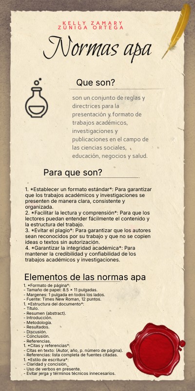 1. *Formato de página*:- Tamaño de papel: 8.5 x 11 pulgadas. - Margenes: 1 pulgada en todos los lados. - Fuente: Times New Roman, 12 puntos. 1. *Estructura del documento*: - Título. - Resumen (abstract). - Introducción. - Metodología. - Resultados. - Discusión. - Conclusión. - Referencias. 1. *Citas y referencias*: - Citas en texto: (Autor, año, p. número de página). - Referencias: lista completa de fuentes citadas. 1. *Estilo de escritura*: - Claridad y concisión. - Uso de verbos en presente. - Evitar jerga y términos técnicos innecesarios.