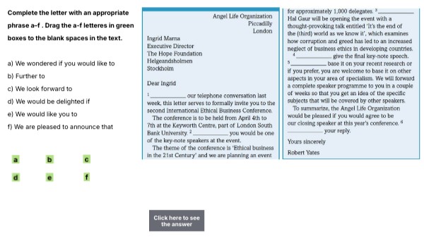 Complete the letter with an appropriate phrase a–f . Drag the a-f letteres in green boxes to the blank spaces in the text. a) We wondered if you would like to b) Further to c) We look forward to d) We would be delighted if e) We would like you to f) We are pleased to announce that