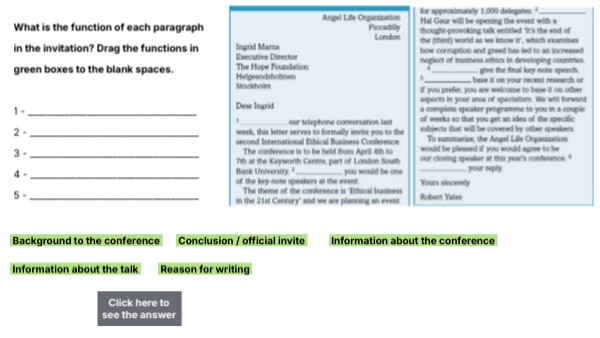 What is the function of each paragraph in the invitation? Drag the functions in green boxes to the blank spaces. 1 - _____________________________________ 2 - _____________________________________ 3 - _____________________________________ 4 - _____________________________________ 5 - _____________________________________