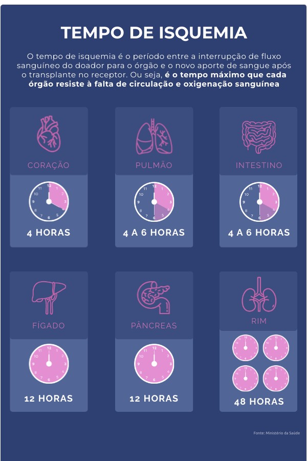 O tempo de isquemia é o período entre a interrupção de fluxo sanguíneo do doador para o órgão e o novo aporte de sangue após o transplante no receptor. Ou seja, é o tempo máximo que cada órgão resiste à falta de circulação e oxigenação sanguínea