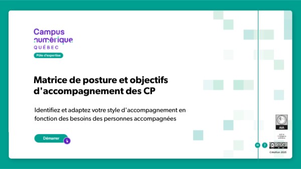 Myriam Arsenault, conseillère pédagogique en technopédagogie, cégep de ValleyfieldMarie-Josée Tondreau, technopédagogue, cégep de l’Abitibi-TémiscamingueMarie-Christine Joseph, chargée de projet, Pôle d’expertise interordres en formation à distance Pour citer ce document : Pôle d’expertise interordres en formation à distance. (2024). Matrice de posture et objectifs d'accompagnement des CP. Campus numérique Québec. Sous licence CC-BY-NC. https://view.genially.com/673ce579248335c510a047f5