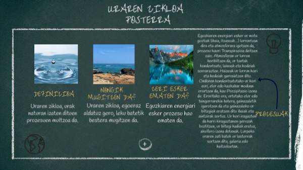 Eguzkiaren energiari esker ur mota guztiak (ibaia, itsasoak...) lurruntzan dira eta atmosferara igotzen da, prozesu hauri Transpirazioa deitzen zaio. Atmosferan ur lurrun horibiltzen da, ur tantak kondentsatu, lainoak eta hodeiak sorrarazten. Haizeak ur lurrun hori eta hodeiak garraiatzen ditu. Ondoren kondentsatutako ur hori euri, elur edo kazkabar moduan erortzen da, hau Prezipitasio izena du. Eroritako ura, urtutako elur edo txingorrarekin batera, gainazaletik igarotzen da eta gainazaleko ur biltegiak eratzen ditu ibaiak eta aintzirak sortuz. Ur hori iragazten da harri kiragaztanen geruzak buztitzen, ur biltegi hadiak eratuz, akuifero izena dutenak. Lurpeko uraren zati batek ur lasterrak sortzen ditu, galeria edo haitzuloetan.