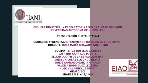 ESCUELA INDUSTRIAL Y PREPARATORIA TECNICA ¨ÁLVARO OBREGÓN ¨UNIVERSIDAD AUTONOMA DE NUEVO LEÓN PRESENTACIÓN DIGITAL ETAPA 4 UNIDAD DE APRENDIZAJE: FENOMENOS QUÍMICOS EN EL ENTORNO DOCENTE: ROSA MARÍA CHÁVARRI GUERRERO EQUIPO 1: LITZY BOTELLO VAZQUEZ JATHZIRY CARRILLO PUENTE SELENY JUDITH DE LA CERDA LEDEZMA ANGEL NICOLAS ELIZONDO REYNA JORGE ARMANDO GARCÍA ARANDA VALERIA RODRIGUEZ LEDEZMA HUGO VILLARREAL SERVIN GRUPO: 3C1 LINARES N. L. a 21/11/24