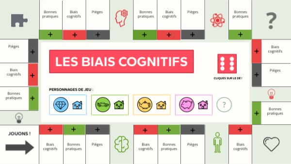 Règles du jeu Vous êtes chargés de recrutement et vous vous formez sur les différents biais cognitifs. Chaque joueur joue avec et pour son équipe. Une bonne réponse vous apporte 1 point. Une bonne réponse bonus vous apporte 2 points. Chaque équipe joue chacun son tour, le ou la plus jeune commence avec son équipe ! La partie prend fin dès que l'une des équipes atteint 10 points. Bonne chance !