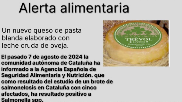 El pasado 7 de agosto de 2024 la comunidad autónoma de Cataluña ha informado a la Agencia Española de Seguridad Alimentaria y Nutrición. que como resultado del estudio de un brote de salmonelosis en Cataluña con cinco afectados, ha resultado positivo a Salmonella spp.