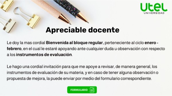 Le doy la mas cordial Bienvenida al bloque regular, perteneciente al ciclo enero - febrero, en el cual le estaré apoyando ante cualquier duda u observación con respecto a los instrumentos de evaluación. Le hago una cordial invitación para que me apoye a revisar, de manera general, los instrumentos de evaluación de su materia, y en caso de tener alguna observación o propuesta de mejora, la puede enviar por medio del formulario correspondiente.