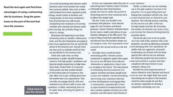 Read the text again and find three advantages of using a networking site for business. Drag the green boxes to the part of the text that have the answers.