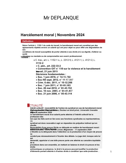 Intérêt collectif : recevabilité de l'action du syndicat en cas de harcèlement moral Dalloz actualité / Raphaël Serres, Docteur en droit privé, Université Grenoble Alpes - Le harcèlement moral d'un salarié porte atteinte à l'intérêt collectif de la profession dès lors que les faits sont en lien avec ses fonctions syndicales ou représentatives. Un syndicat est donc recevable à agir en réparation du préjudice indirect qui en résulte. Recevabilité d'une preuve illicite ou déloyale en matière de harcèlement moral : Dalloz actualité / Sonia Norval-Grivet, Magistrate – 11 septembre 2024 L'illicéité ou la déloyauté dans l'obtention ou la production d'un moyen de preuve ne conduit pas nécessairement à l'écarter des débats. Le juge doit, lorsque cela lui est demandé, apprécier si une telle preuve porte une atteinte au caractère équitable de la procédure dans son ensemble, en mettant en balance le droit à la preuve et les droits antinomiques en présence, le droit à la preuve pouvant justifier la production d'éléments portant atteinte à d'autres droits à condition que cette production…