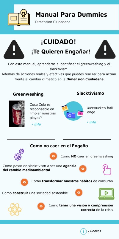 Con este manual, aprenderas a identificar el greenwashing y el slacktivism.Ademas de acciones reales y efectivas que puedes realizar para actuar frente al cambio climático en la Dimension Ciudadana