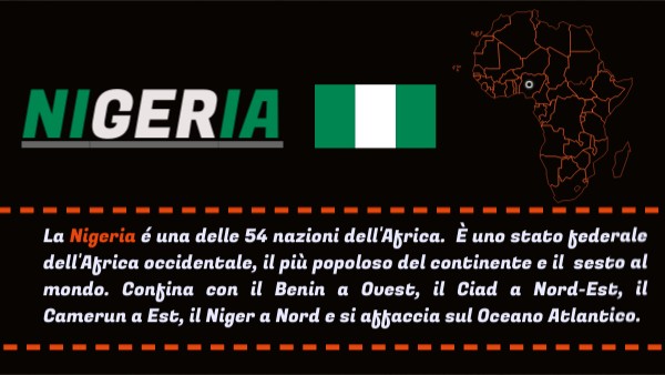 La Nigeria é una delle 54 nazioni dell'Africa. È uno stato federale dell'Africa occidentale, il più popoloso del continente e il sesto al mondo. Confina con il Benin a Ovest, il Ciad a Nord-Est, il Camerun a Est, il Niger a Nord e si affaccia sul Oceano Atlantico.